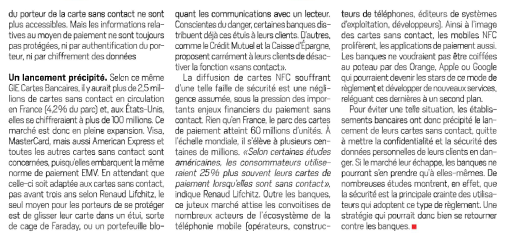 Le moins qu'on puisse dire est que sur ce coup là les banques sont allées beaucoup trop vite, avec une technologie absolument pas sécurisée, ce qui est un peu fort de café pour des banques. Surtout que, si je ne m'abuse, ce sont les banques qui payent les dégâts (de mauvaise grâce) lorsqu'on a utilisé à votre votre carte de crédit à votre insu. Ce qui signifie, soit que les banques sont naïves (ce qui m'étonnerait fort) soit qu'elles ont trop d'argent pour s'arrêter à ce genre de détails.